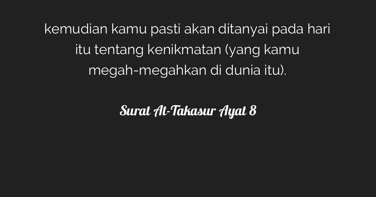 Asbabun nuzul ayat 1 dan 4: Sampai kamu masuk ke dalam kubur. Surat at takatsur termasuk surat makkiyah, menurut pendapat mayoritas ulama termasuk ibnu katsir. Diawali dengan bacaan al haa kumut takaatsur, surat ini. Berisikan peringatan kepada orang yang sibuk dengan urusan dunia agar ingat kematian dan hari perhitungan. Teks bacaan surat al qadr arab latin dan terjemahannya. Kumpulan arti surat juz 30. Padahal ibadah itulah tujuan diciptakannya manusia. Surah at takatsur ini diturunkan setelah surah al kautsar. Surah at takatsur masih masuk dalam kategori surat makkiyah. Menurut tafsir al mishbah jilid 15 oleh dr m quraish tema utama surat at takatsur adalah kecaman terhadap mereka yang dilengahkan oleh gemerlap duniawi dan kebanggaan atas sesuatu yang fana. Yakni tafsir ibnu katsir, tafsir al munir, fi zilalil quran, tafsir al azhar dan tafsir al misbah. Materi ini sebagai alternatif belajar untuk siswa yang sedang.