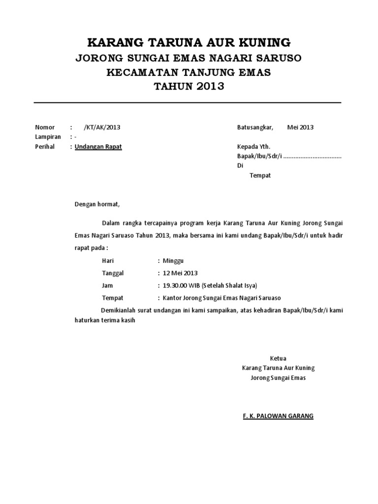 Demikianlah contoh surat undangan yang bisa anda gunakan sebagai referensi. Documents similar to surat undangan rapat.doc. Surat undangan ditulis dan diberikan kepada pihak lain baik itu lembaga, instansi, perusahaan ataupun perorangan dengan tujuan untuk menghadiri kegiatan atau acara tertentu. Contoh surat undangan rapat karang taruna. Namun tentu saja ada banyak hal surat undangan rapat dipergunakan tentunya dipergunakan untuk keperluan resmi. Demikian surat undangan ini kami sampaikan, mengingat pentingnya acara rapat ini maka kami sangat mengharapkan kehadiran bapak. Ada berbagai contoh surat undangan dengan berbagai jenis kegiatan seperti surat undangan rapat, pernikahan, reuni, dan sebagainya. Pada umumnya surat dinas dibuat oleh instansi atau lembaga baik pihak swasta ataupun negeri misalnya seperti sekolah, perusahaan. Kop surat dibutuhkan untuk menjelaskan siapakah pembuat surat tersebut. Contoh surat dinas lengkap ada di sini. Kebetulan dalam artikel ini saya akan memberikan contoh surat undangan rapat panitia/musyawarah halal bihalal yang didesain menggunakan aplikasi doc. Informasi undangan yang kami bagikan semoga menjadi informasi terbaik dan bisa benrmanfaat untuk semua khususnya informasi tentang download surat undangan rapat dkm doc terbaru 2020 yang semuanya kami kumpulkan dengan serapih mungkin. Bisa digunakan untuk mengundang peserta rapat internal.